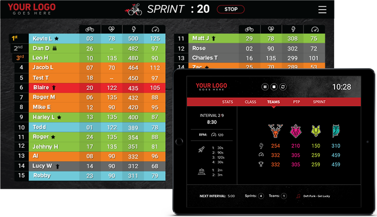 • Track real-time watts, RPM, and calories burned as well as rank members based on performance